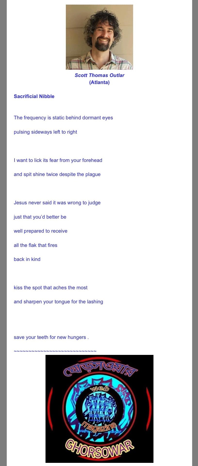 I’m stoked that my poem “Sacrificial Nibble” has been published here in the August issue of GHORSOWAR released out of West Bengal. Thank you to Nihar Ranjan Das for including my work.